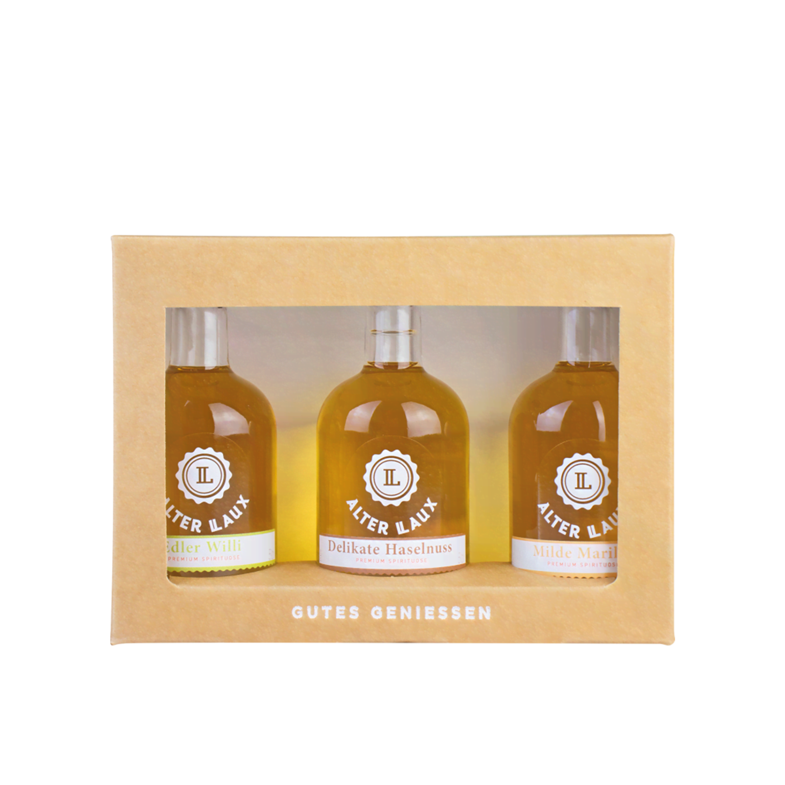 LAUX is famous and well-known for its intensely aromatic ALTER LAUX collection from its own factory. With one bottle (50 ml) of ALTER LAUX Noble Willi , ALTER LAUX Mild Mirabelle and ALTER LAUX Delicate hazelnut This elegant gift set contains a fine selection for the best enjoyment.