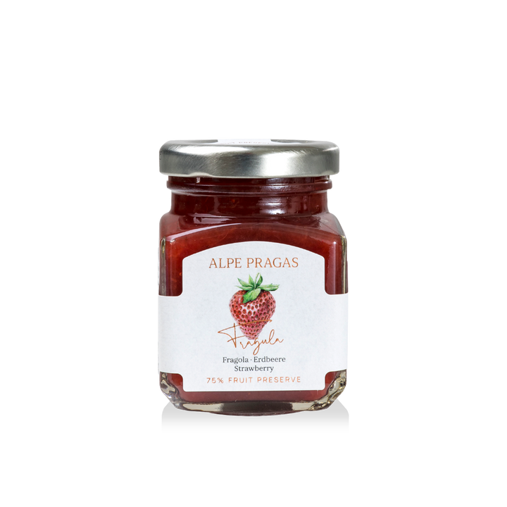 Made from sun-ripened, aromatic strawberries. The Senga Sengana variety grown and used by Alpe Pragas is medium-early ripening with medium-sized, dark red fruits and was bred by Reinhold von Sengbusch around 1950. Strawberries contain so much vitamin C that 150 g of them cover the daily requirement. They contain more vitamin C than oranges or lemons. They also have the highest manganese content of all types of fruit. They are also rich in folic acid, calcium, magnesium and iron.