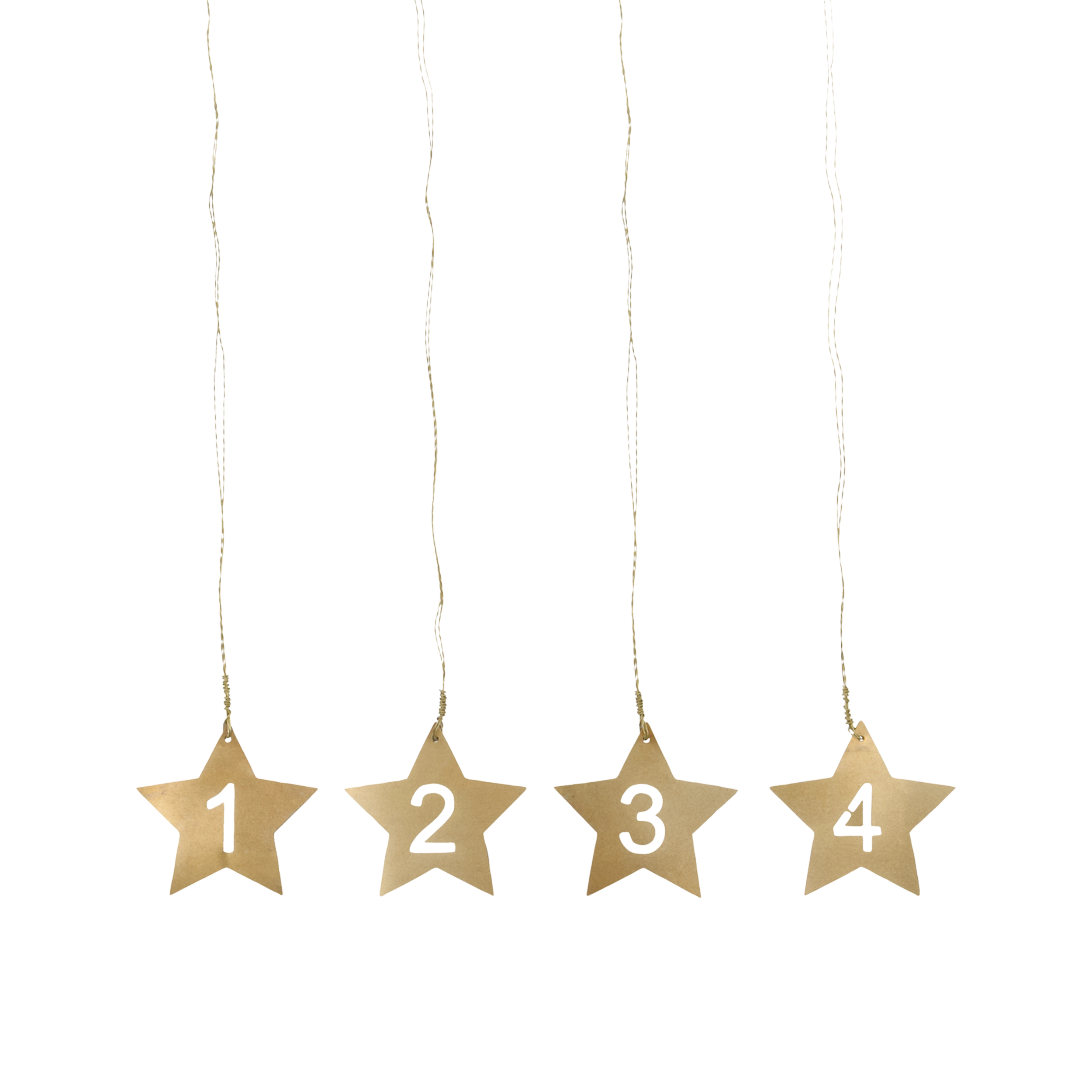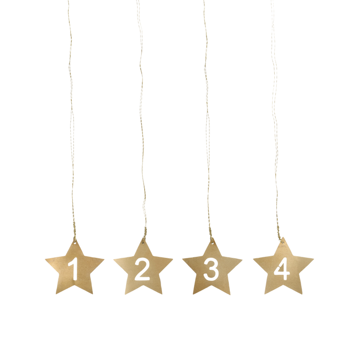 Eine Packung mit 4 Sternen für alle Dekozwecke. Die handgemachten Messingsterne von House Doctor sind von 1 bis 4 nummeriert und damit ideal für Adventsgeschenke oder den Adventskranz. Egal wie du sie benutzt, werden sie das Warten auf Weihnachten einfach nur schöner machen.