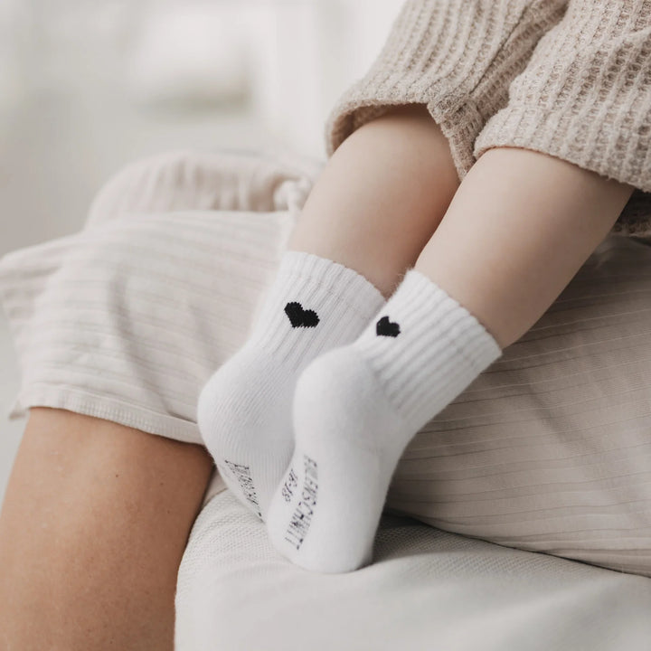 Diese Babysocken mit schwarzem Herz lassen kleine und große Herzen höherschlagen! Mit ihrem minimalistischen Design und dem kontraststarken, eingestickten Herz auf dem Bündchen sind sie ein echter Hingucker für die Allerkleinsten.