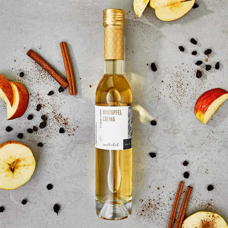 So schmeckt Weihnachten – und zwar als würzig und fruchtig-süße Essigspezialität. Kräftige Apfelnoten, verfeinert mit dem typischen Geschmack von Zimt, Sternanis und all den leckeren Weihnachtsgewürzen, die den Bratapfel so besonders machen. In Form dieser Crema können Sie nun auch Ihr Salatdressing oder Saucen mit diesem einzigartigen Charakter verfeinern.