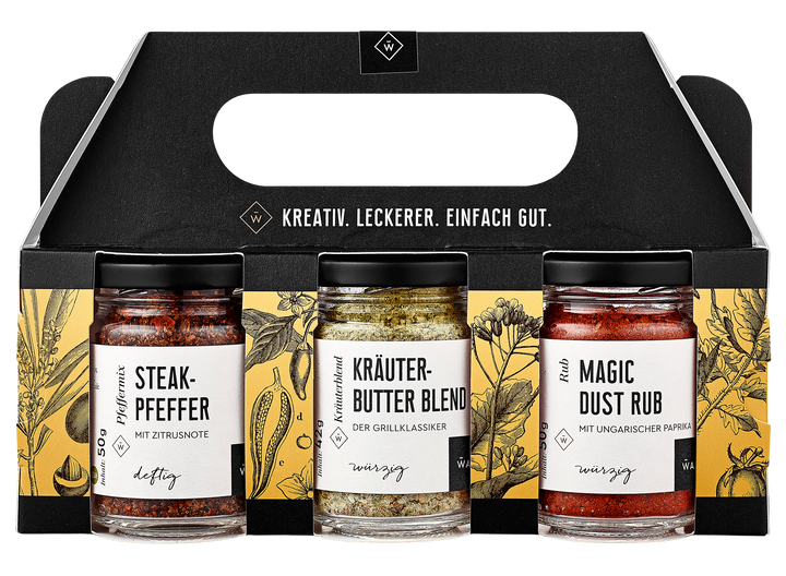 Ein unverzichtbarer Genuss für leckere Grillabende: Das perfekte Gewürzset mit den besten Grillklassikern vereint in einem Probier-Set: Süß-rauchiger Magic Dust Rub, würzig-frischer Steakpfeffer mit Zitrusnote und der Grillklassiker: Unser Kräuterbutter Blend.