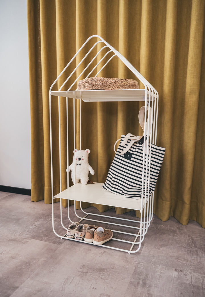Die Kindergarderobe MILLE ist mehr als nur ein funktionales Möbelstück – sie ist ein charmantes Designobjekt, das Kinderzimmern Struktur und Leichtigkeit verleiht. Aus hochwertigem, pulverbeschichtetem Stahl gefertigt, überzeugt MILLE durch ihre matte Feinstruktur-Oberfläche und ihre klare, architektonische Form in Haus-Silhouette.