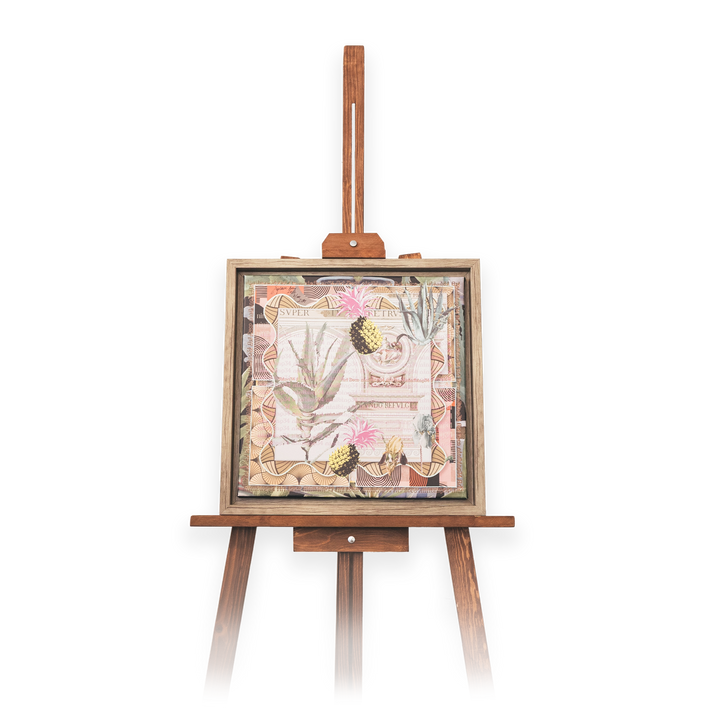 Leuchtend türkise Monstera-Blätter setzen sich besonders ab durch den dunkelgrünen Hintergrund. Ein besonderer Blickfang: die markante Aloe aus dem Garten Mallorcas – exotisch, lebendig, mediterran. Eine goldgelbe Ananas mit auffallender pinker Krone zieht alle Blicke auf sich. Tropisch, verspielt und modern – ein fruchtiger Hingucker mit Pop-Art-Charme.