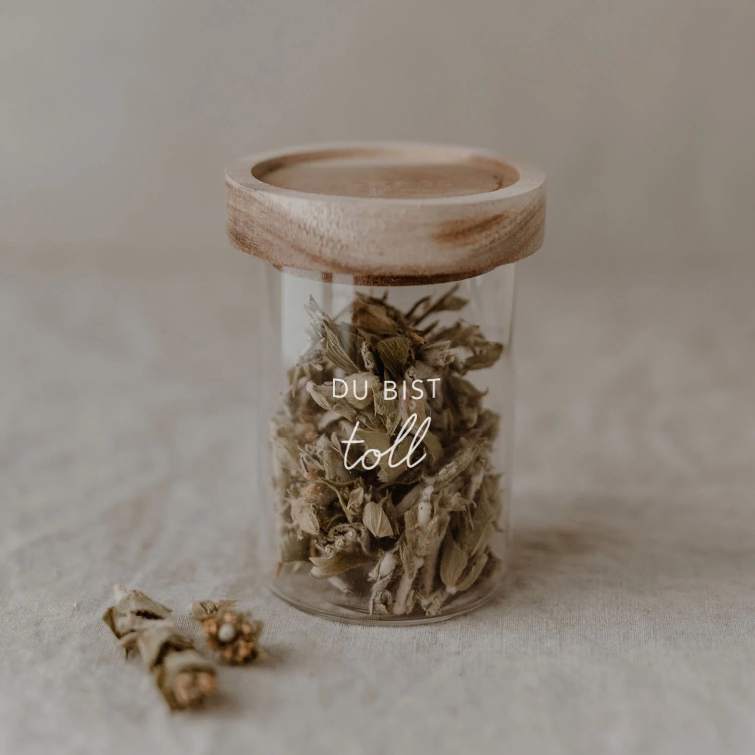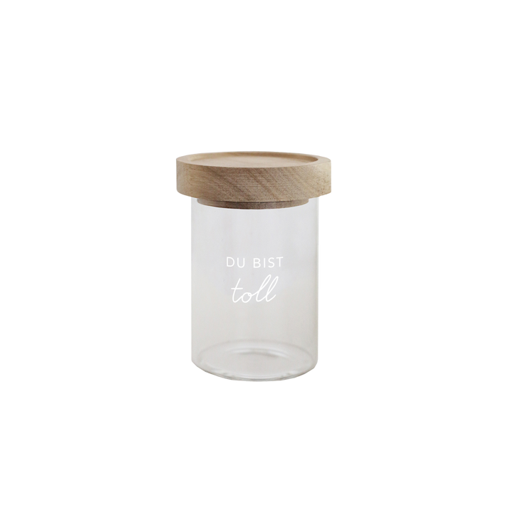 Perfekt zum Verschenken: Dieses kleine Vorratsglas mit dem Aufdruck „Du bist toll“ ist eine liebevolle Verpackung für selbstgemachte Kleinigkeiten. Der Deckel schließt luftdicht. Eine stilvolle und nachhaltige Art, Freude zu schenken.