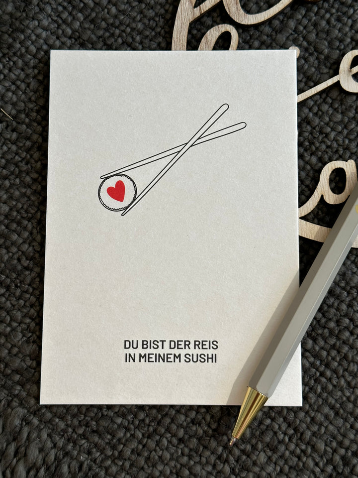 Erwecke deine Liebe und Leidenschaft mit dieser wunderschönen Postkarte - REIS IN MEINEM SUSHI. Zeige deinem Liebsten, wie wichtig er für dich ist und wie glücklich du bist, ihn zu haben. Eine unverzichtbare Erinnerung, ohne die du nicht mehr leben willst. Lass dich von dieser Postkarte inspirieren und verschenke sie an deine besondere Person.
