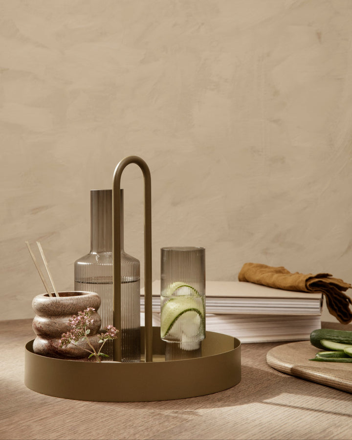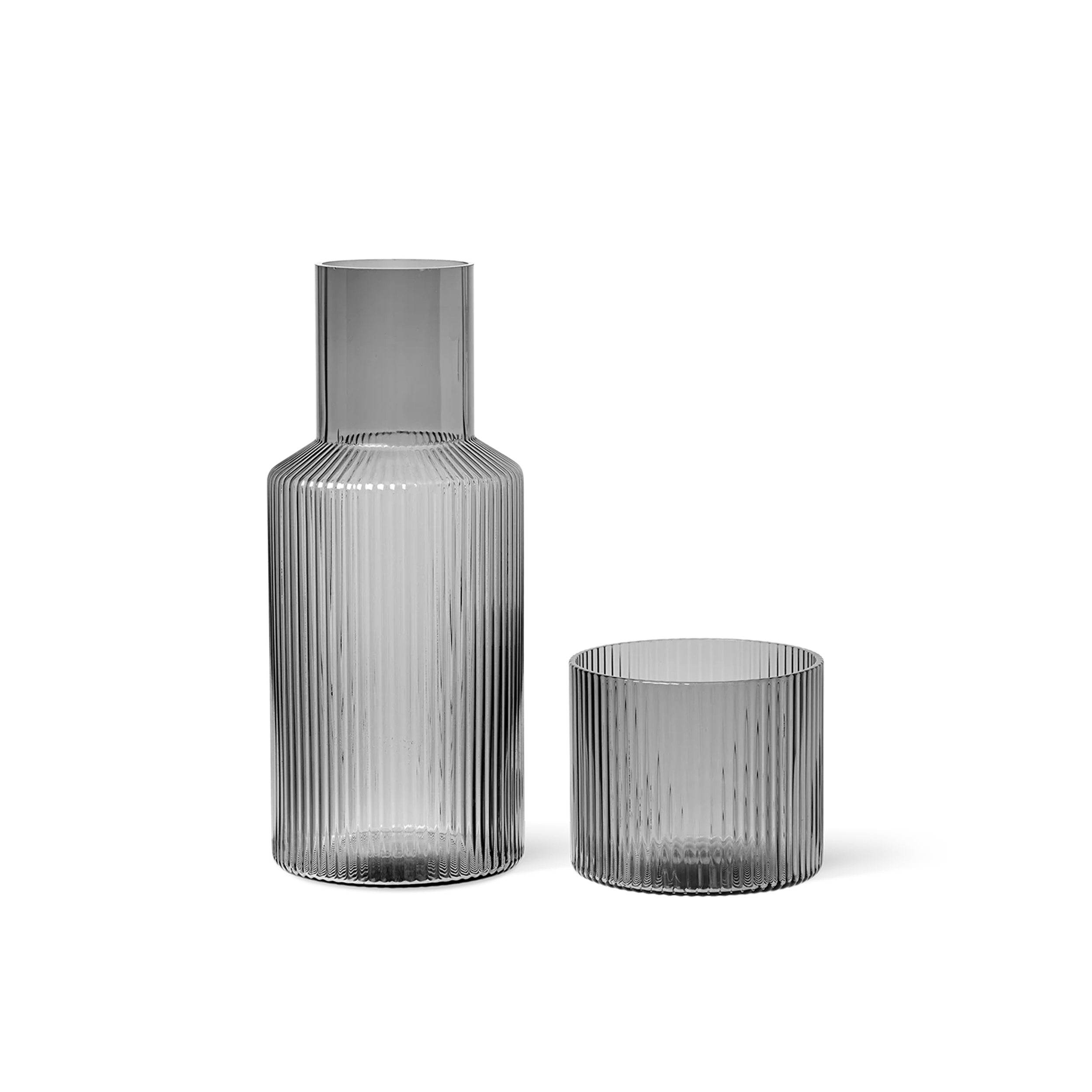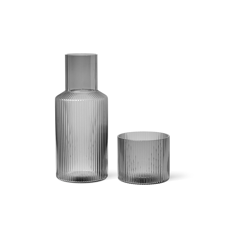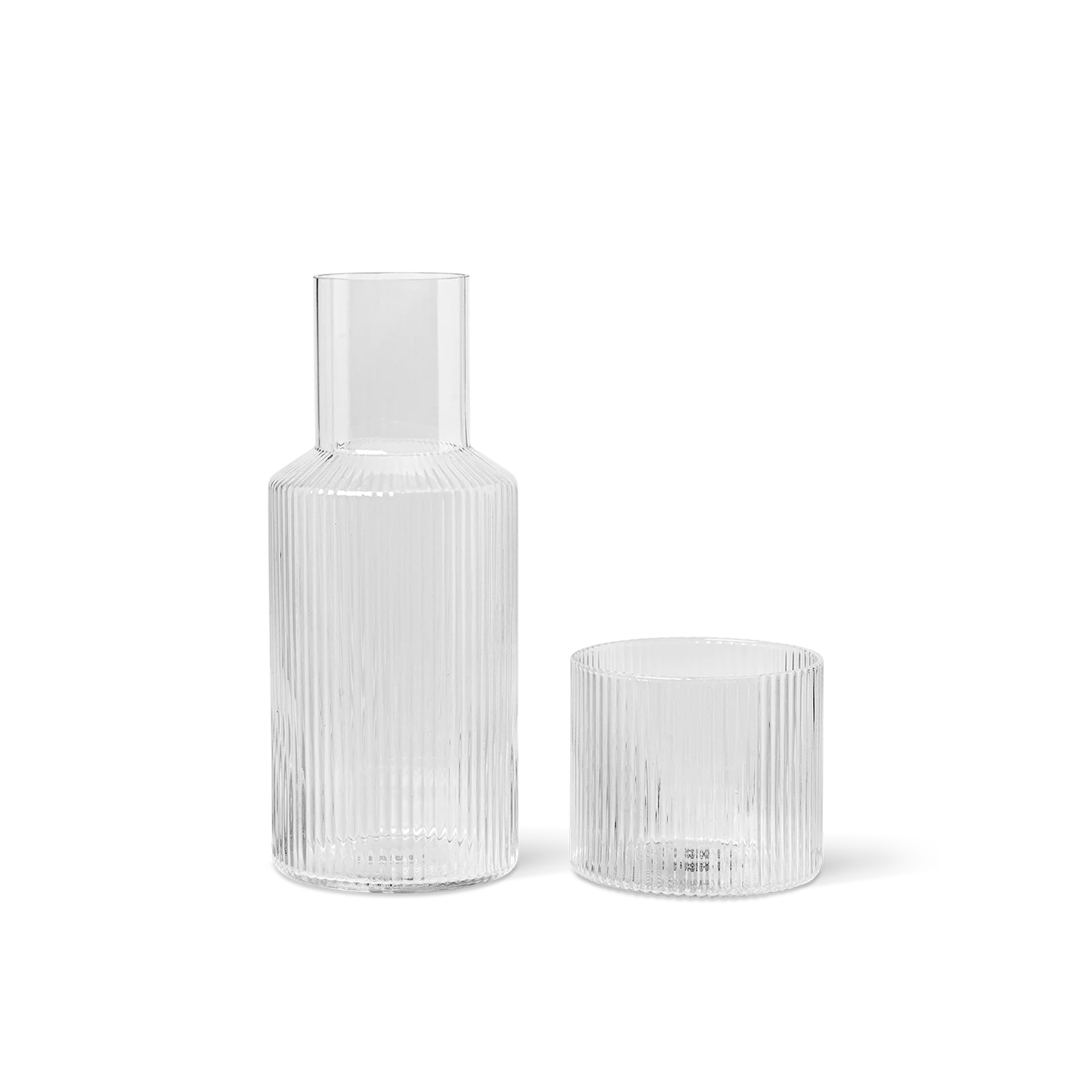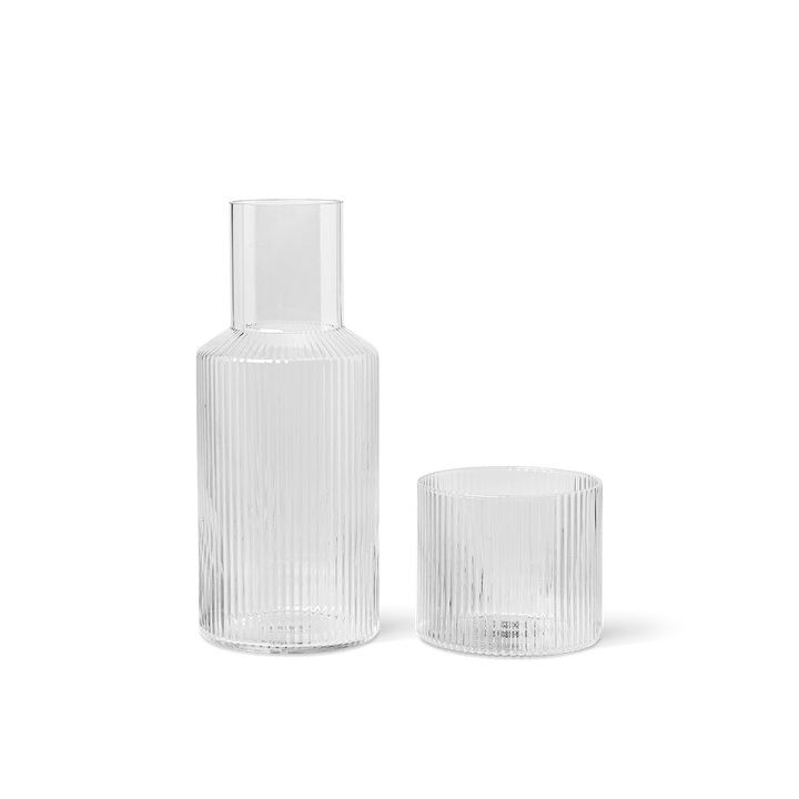 Bleib‘ gesund mit genügend Wasser und diesem handlichen Set aus einer kleinen Karaffe und einem Glas, das auch als Deckel verwendet werden kann. Das Set hat die Charakteristika der Serie mit dem geriffelten mundgeblasenen Glas. Es könnte das neue gesunde Bürozubehör sein oder ein neuer Favorit für den Nachttisch.