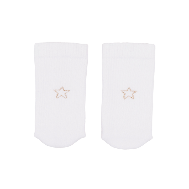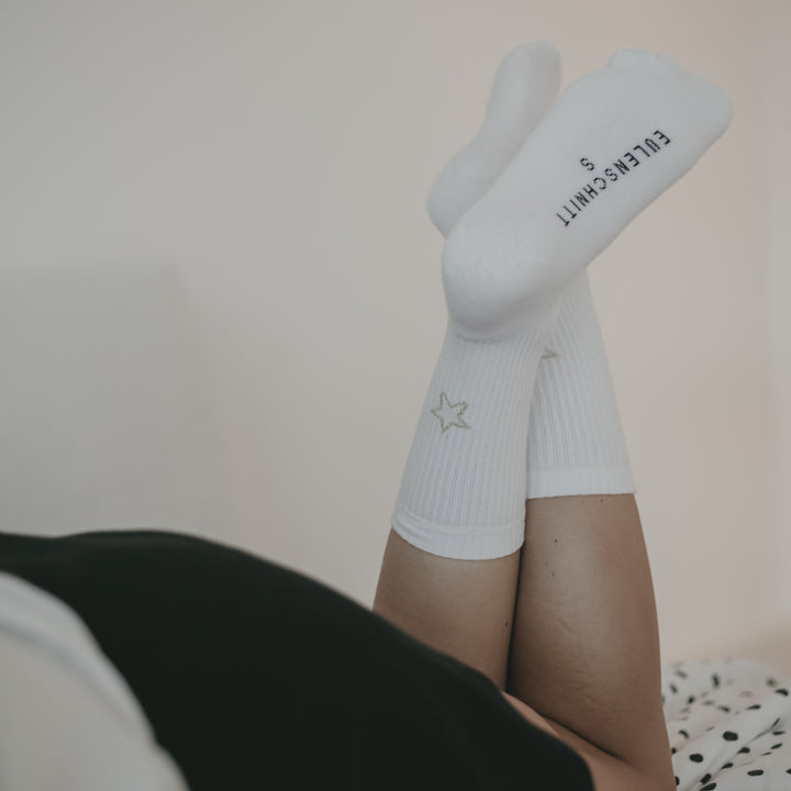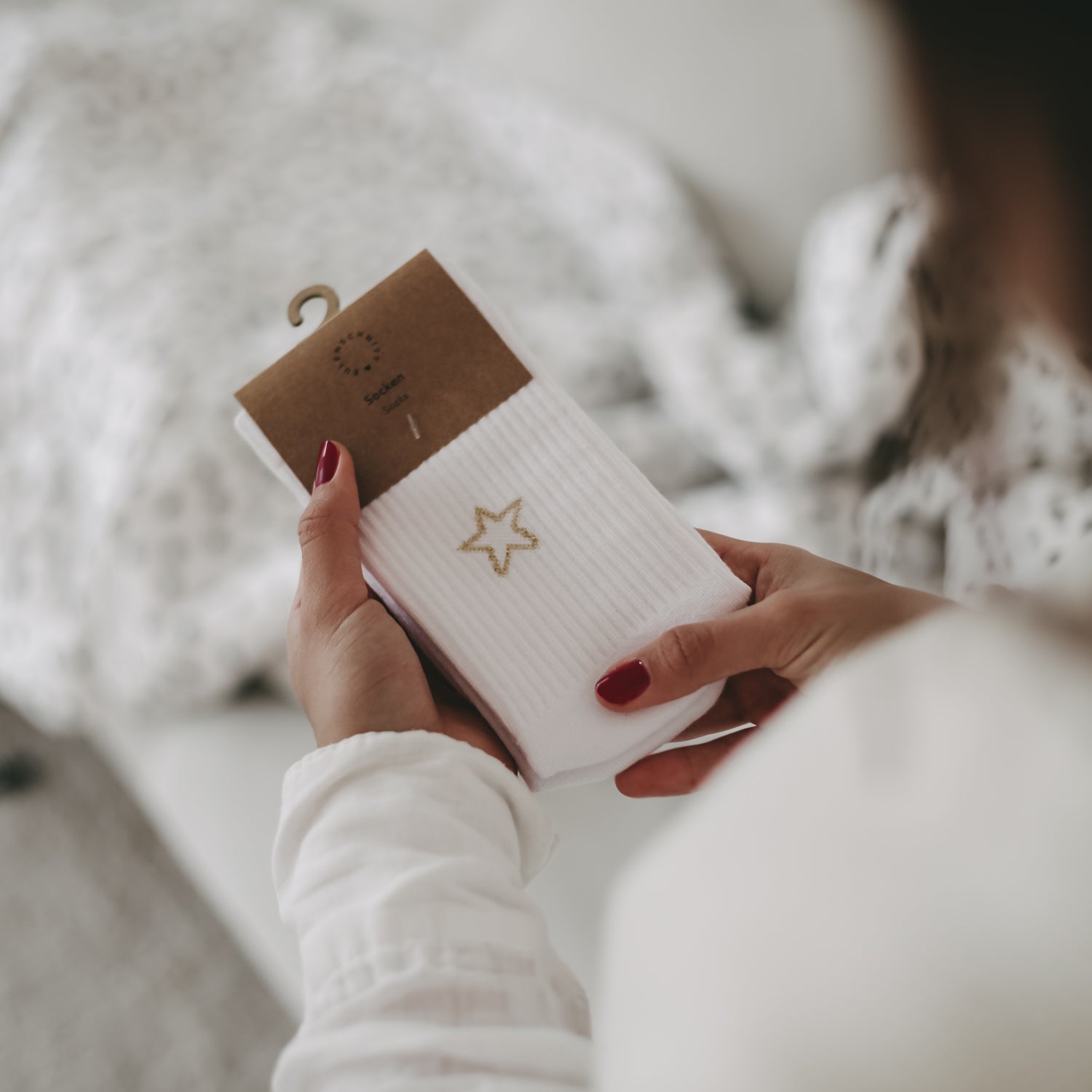 Unsere weißen Socken Stern sind der Inbegriff von Komfort und Stil! Verziert mit einem fein gestickten goldenen Stern, versetzen sie dich sofort in eine festliche Stimmung. Ihr modernes Design und die perfekte Höhe am Bund setzen elegante Akzente – ideal für die kuschelige Jahreszeit.