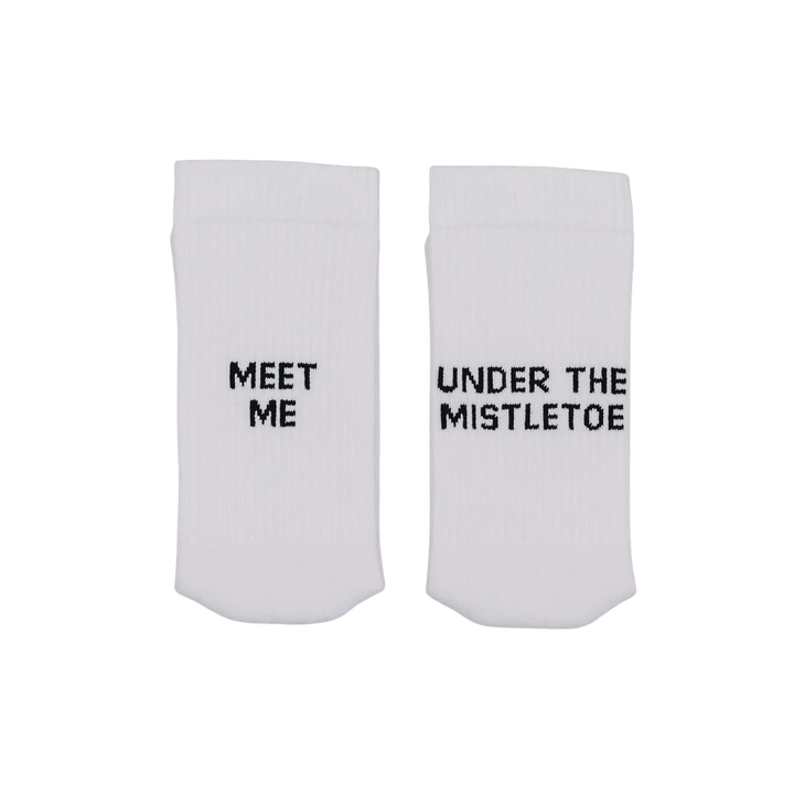 Weihnachten liegt in der Luft – und mit unseren Socken Mistletoe wird es romantisch, gemütlich und ein kleines bisschen verspielt. Der eingestickte Schriftzug „Meet me under the mistletoe“ sorgt nicht nur für ein Lächeln, sondern auch für magische Momente unter dem Mistelzweig.
