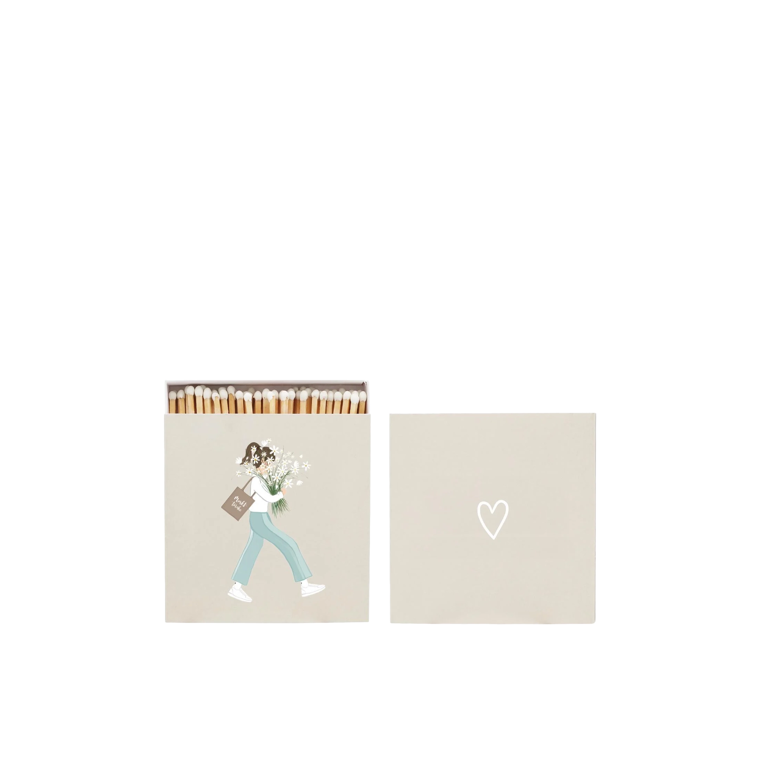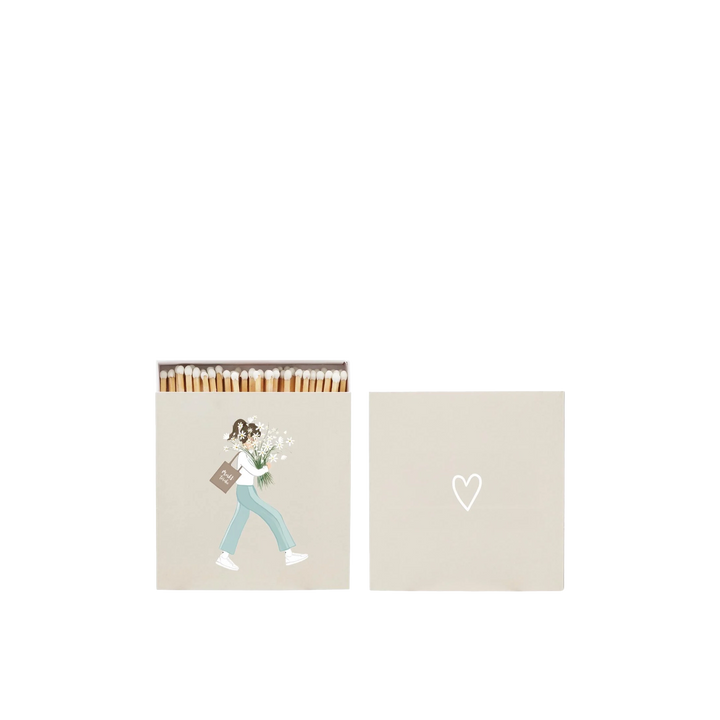 Unsere Streichhölzer Blumenmädchen mit bezauberndem Design und sie bringen einen Hauch von Romantik in dein Zuhause. Auf der Vorderseite strahlt das Blumenmädchen mit einem detailverliebten Gänseblümchenstrauß und unserer charmanten Juteshopper-Markttasche. Die Rückseite zeigt ein zartes Herz – ein minimalistisches Designhighlight. Die Grundfarbe der Schachtel in zartem Rosa unterstreicht die sanfte Eleganz.