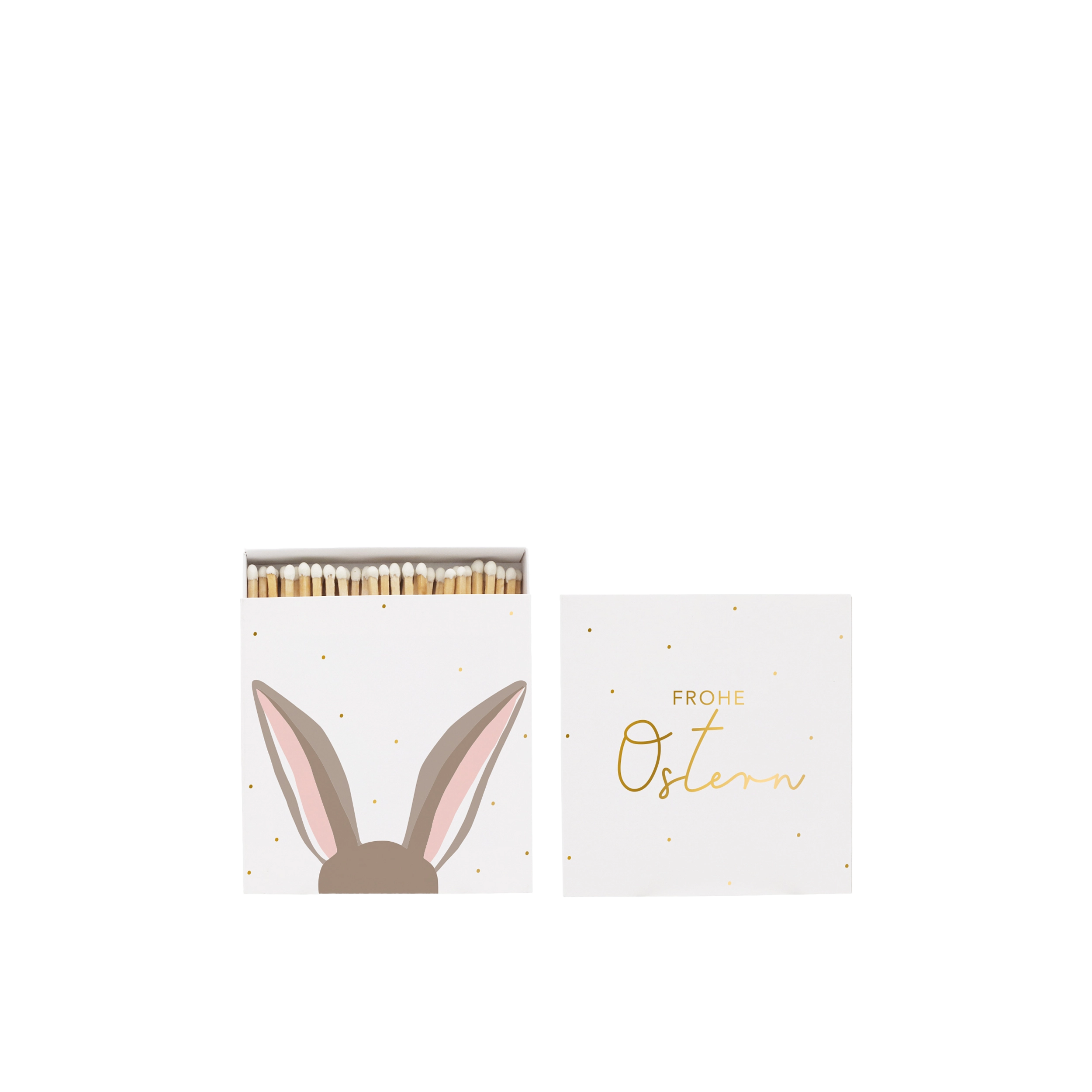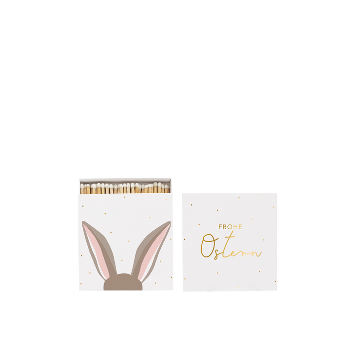 Unsere Streichhölzer Ostern sind die perfekte Ergänzung für eine stimmungsvolle Osterdekoration und bringen auf charmante Weise österliche Freude in dein Zuhause. Auf der einen Seite zieren niedliche Hasenohren einen weißen Hintergrund mit goldenen Punkten, auf der anderen Seite strahlt der Schriftzug „Frohe Ostern“ in goldener Schrift – ebenfalls eingerahmt von zarten goldenen Punkten.