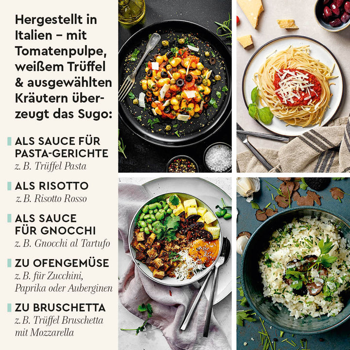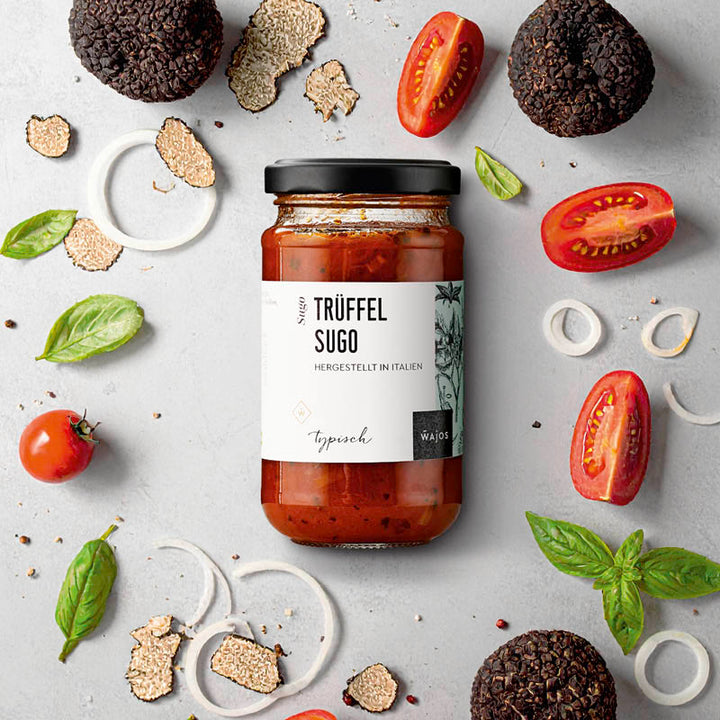 Dieses Sugo ist purer Luxus: Eine intensive Tomatenbasis, veredelt mit dem tiefen, erdigen Aroma von feinem Trüffel. Es ist unglaublich lecker und verleiht Pastagerichten, Risotto oder Bruschetta im Handumdrehen eine unwiderstehlich elegante Note.