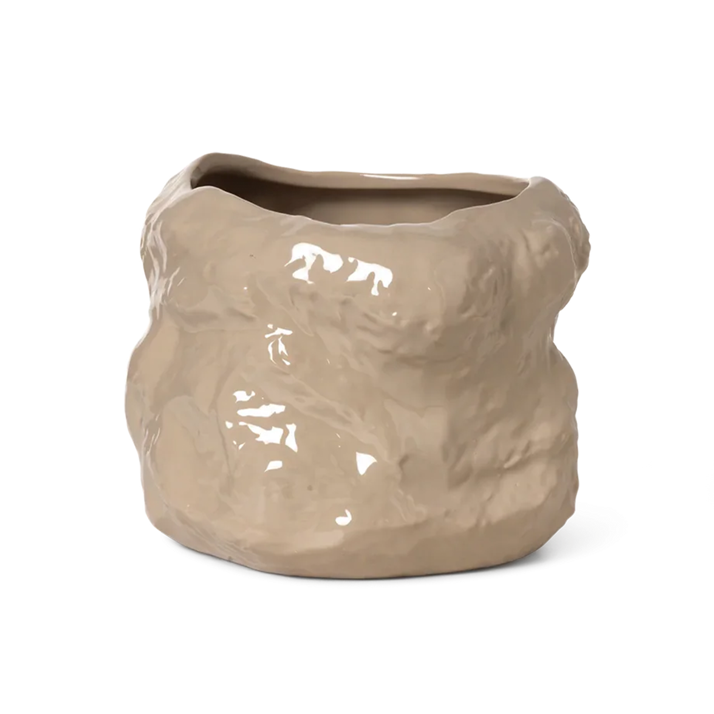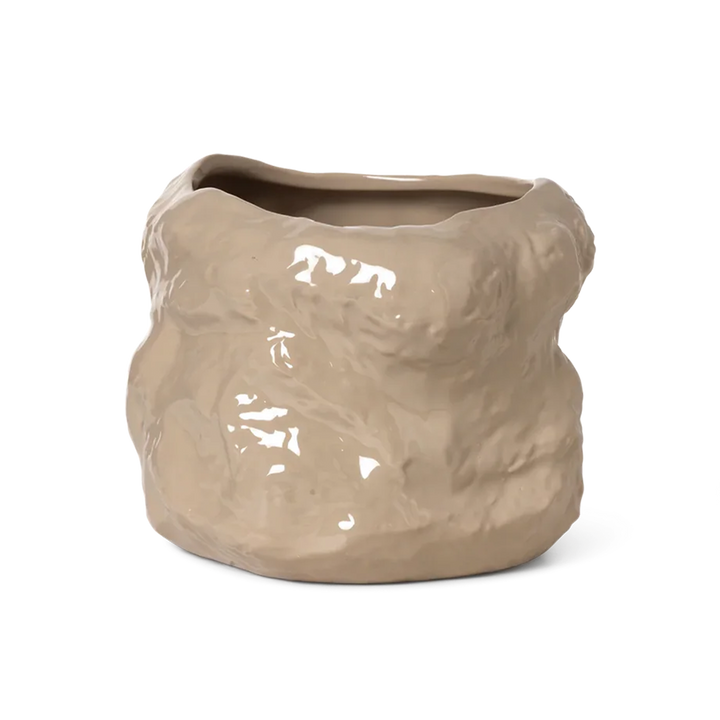 Der ursprünglich von Hand geformte Tuck Pot bietet die perfekte Balance zwischen Zweckmäßigkeit und Leistungsstärke. Das künstlerische Stück ist mit einer Hochglanzglasur in cremiger Kaschmirfarbe beschichtet, was einen Licht reflektierenden Effekt erzeugt, der die zerfurchte Oberfläche zur Geltung bringt. Du kannst den Topf mit Blumen oder Zweigen füllen oder in deinem Zuhause schlicht als Kunstwerk erstrahlen lassen.