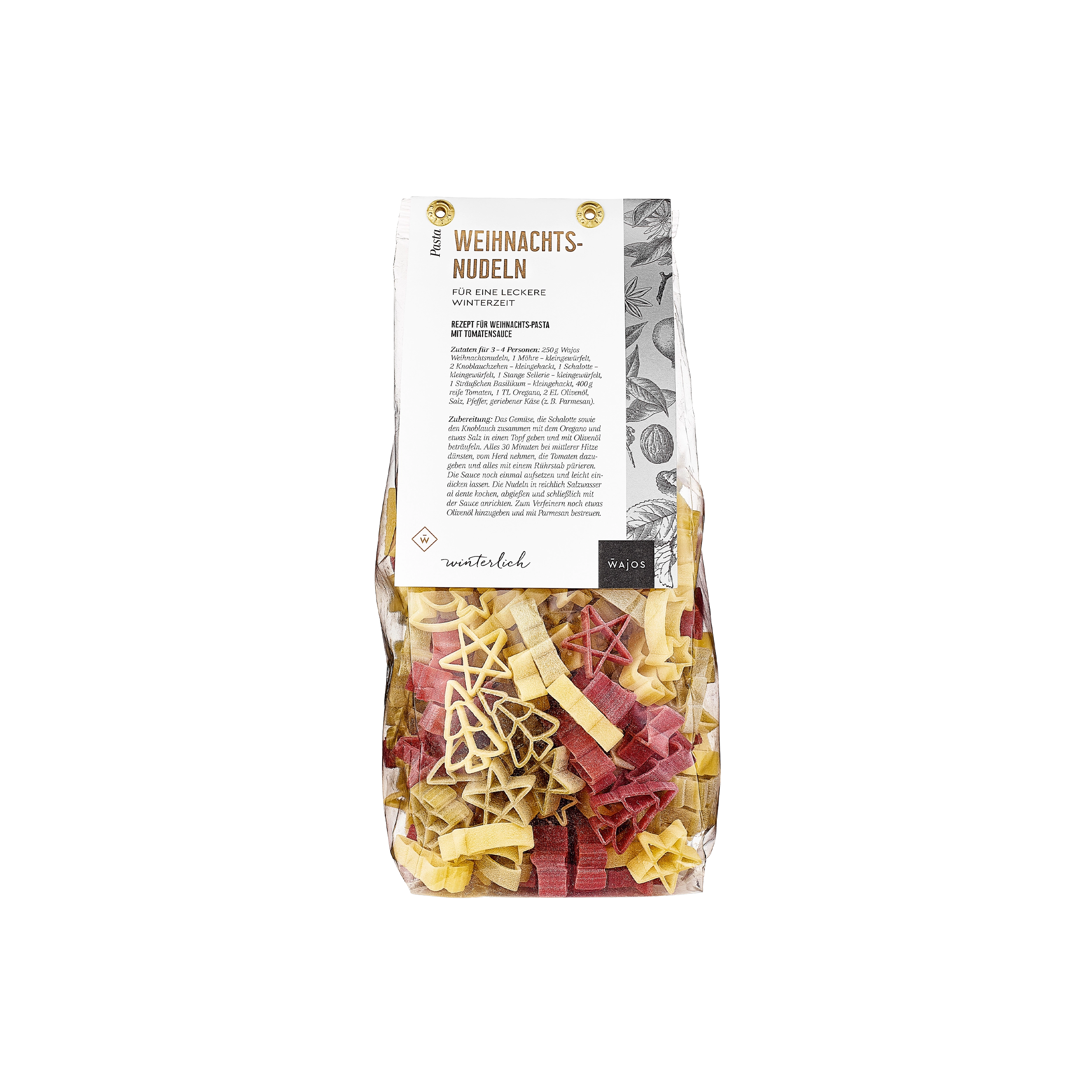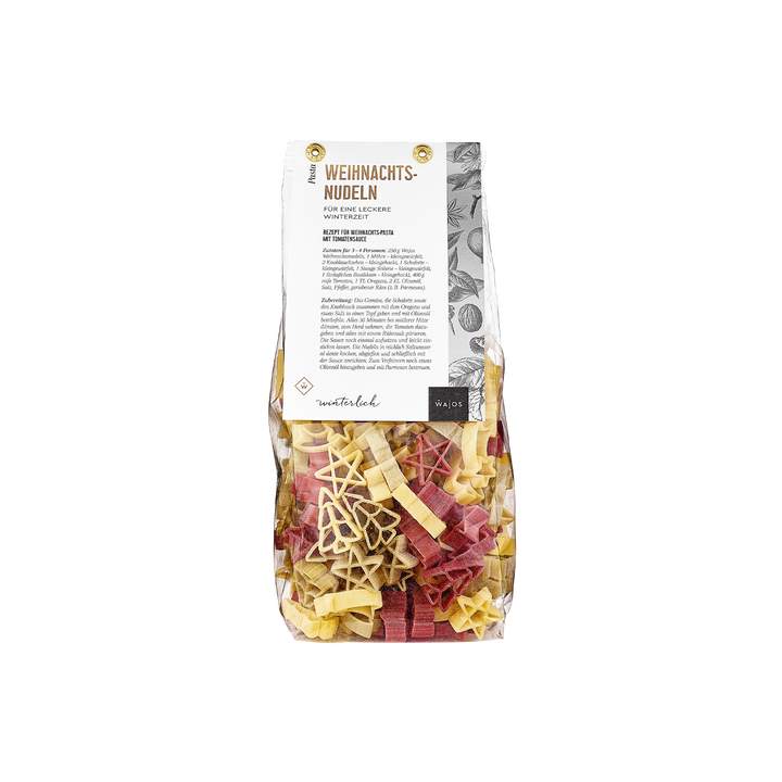 Für noch mehr Weihnachten auf Ihrem Teller! Diese Nudeln aus Hartweizengrieß sind die perfekte Beilage für Ihr Festessen: eine bunte Mischung in Sternen-, Weihnachtsmann- und Tannenbaumform. Mit ihrem feinen und dezenten Geschmack nach Spinat und Tomate sind sie außerdem besonders vielseitig und machen Ihr Lieblings-Festtagsessen gleich noch leckerer.