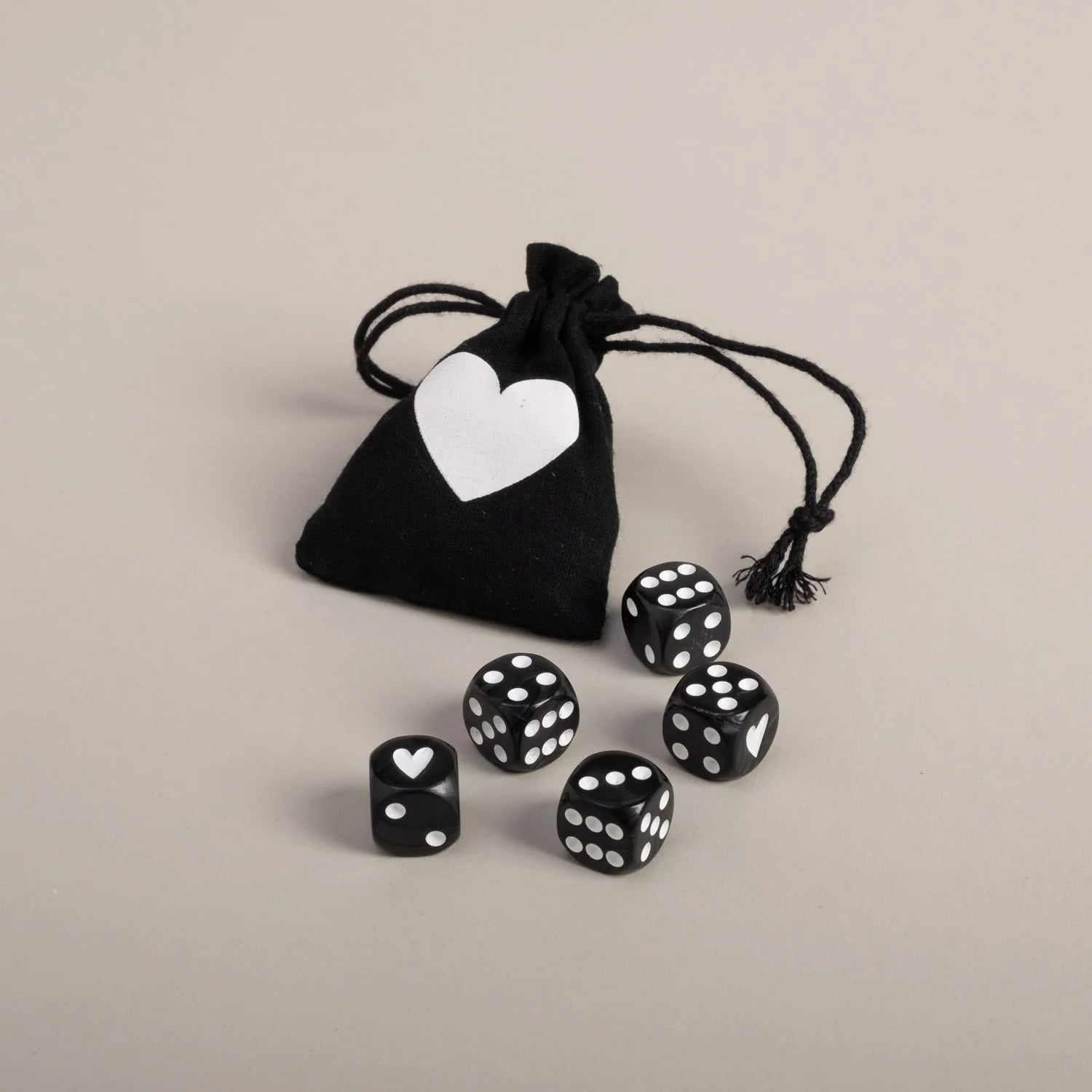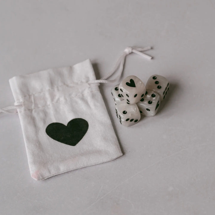 Dieses Würfelset in Perlmuttstruktur ist ein echter Blickfang, denn die Eins wird durch ein Herzchen dargestellt. Im praktischen Stoffbeutel mit Herzprint sind die Würfel immer griffbereit – perfekt für unterwegs oder als Geschenk für alle, die Spiele lieben.
